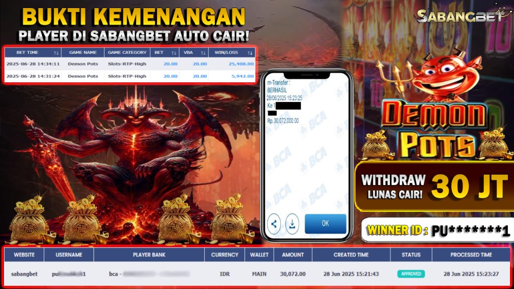 BUKTI KEMENANGAN 28 JUNI 2025 DI GAME DEMON POTS WD 30 JUTA