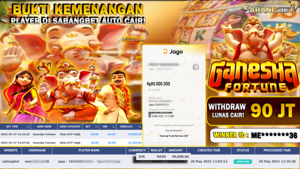 BUKTI KEMENANGAN 28 MEI 2025 DI GAME GANESHA FORTUNE WD 90 JUTA