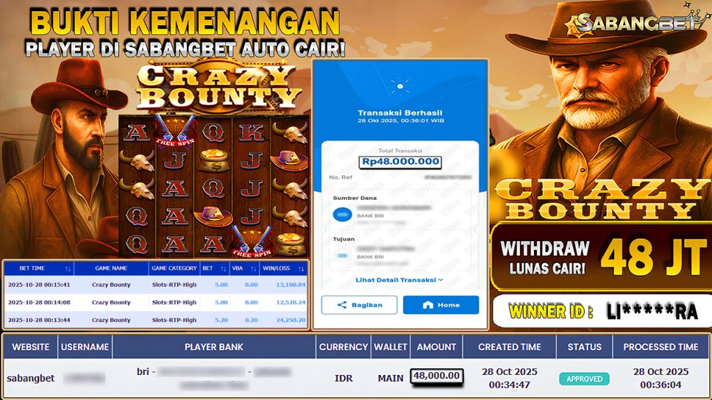 BUKTI KEMENANGAN 28 OKTOBER 2025 DI GAME CRAZY BOUNTY WD 48 JUTA