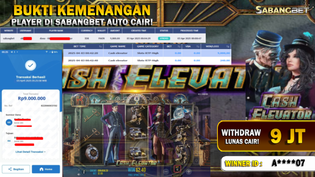 BUKTI KEMENANGAN 3 APRIL 2025 DI GAME CASH ELEVATOR WD 9 JUTA