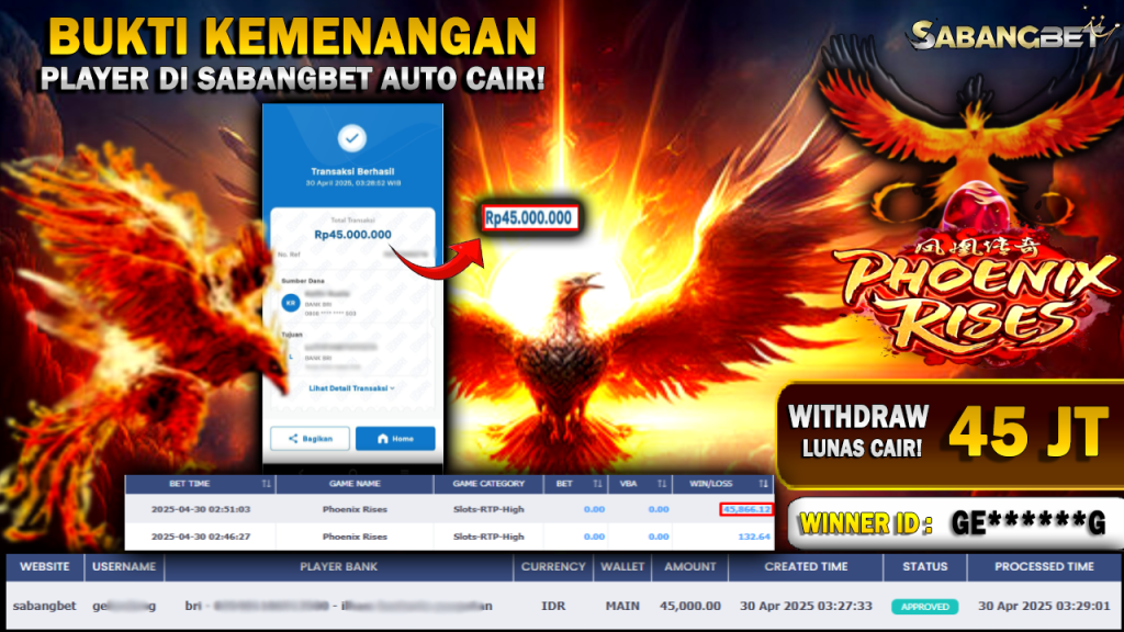 BUKTI KEMENANGAN 30 APRIL 2025 DI GAME PHOENIX RISES WD 45 JUTA