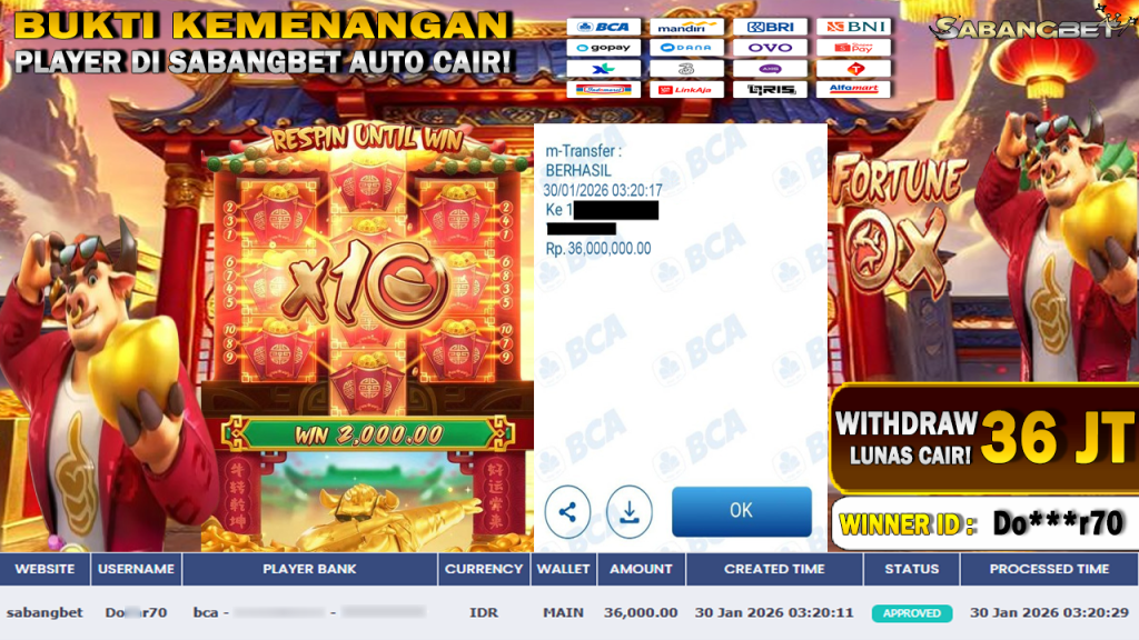 BUKTI KEMENANGAN 30 JANUARI 2026 DI GAME FORTUNE OX WD 36 JUTA