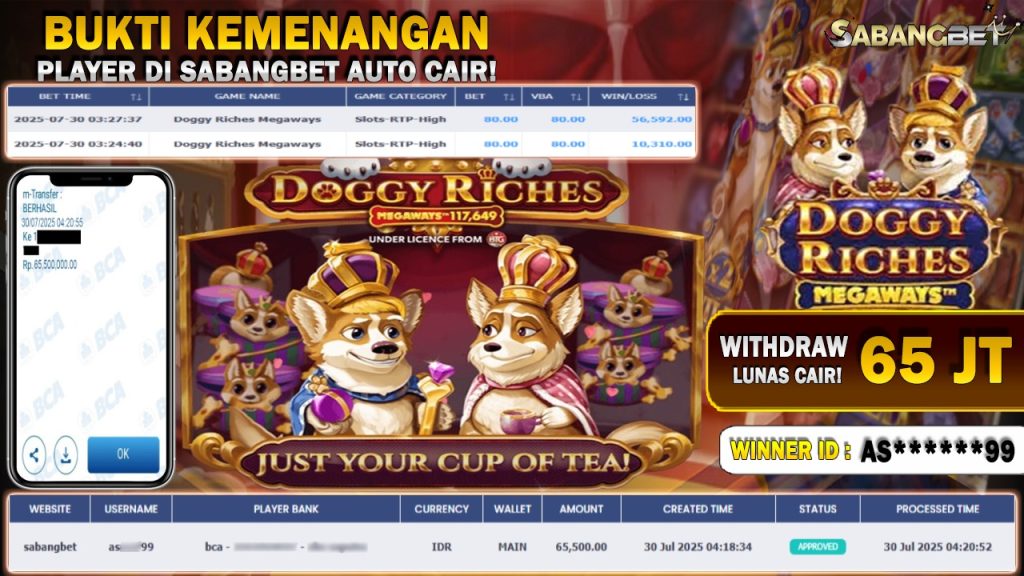 BUKTI KEMENANGAN 30 JULI 2025 DI GAME DOGGY RICHES MEGAWAYS WD 65 JUTA