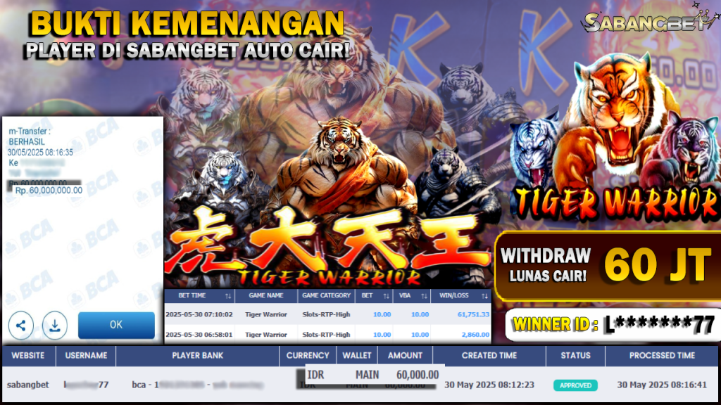 BUKTI KEMENANGAN 30 MEI 2025 DI GAME TIGER WARRIOR WD 60 JUTA