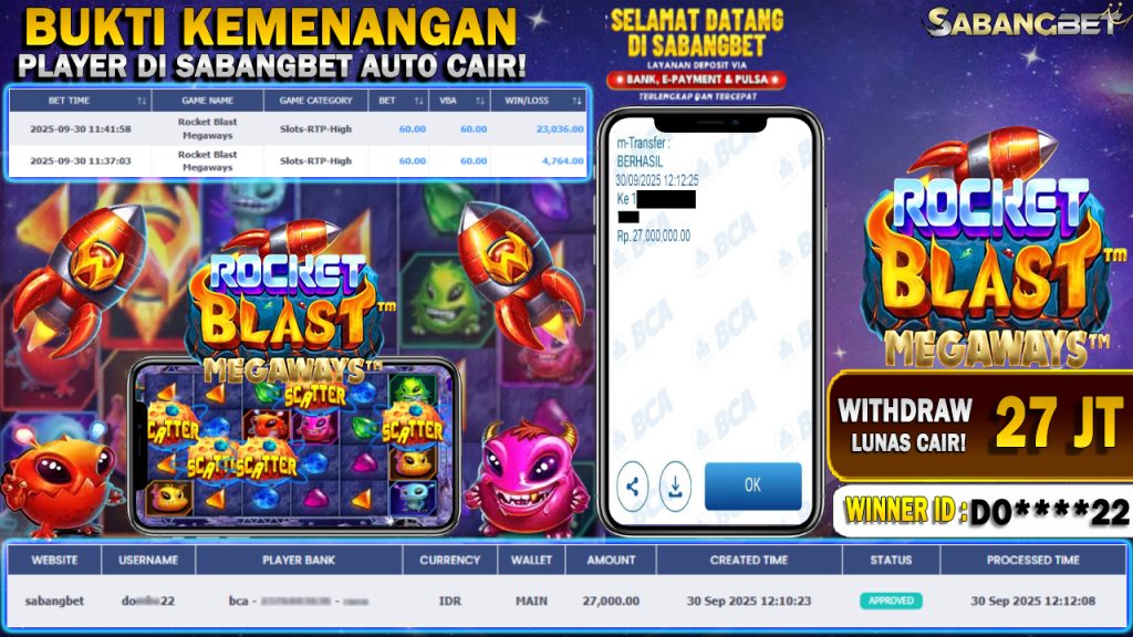 BUKTI KEMENANGAN 30 SEPTEMBER 2025 DI GAME ROCKET BLAST MEGAWAYS WD 27 JUTA