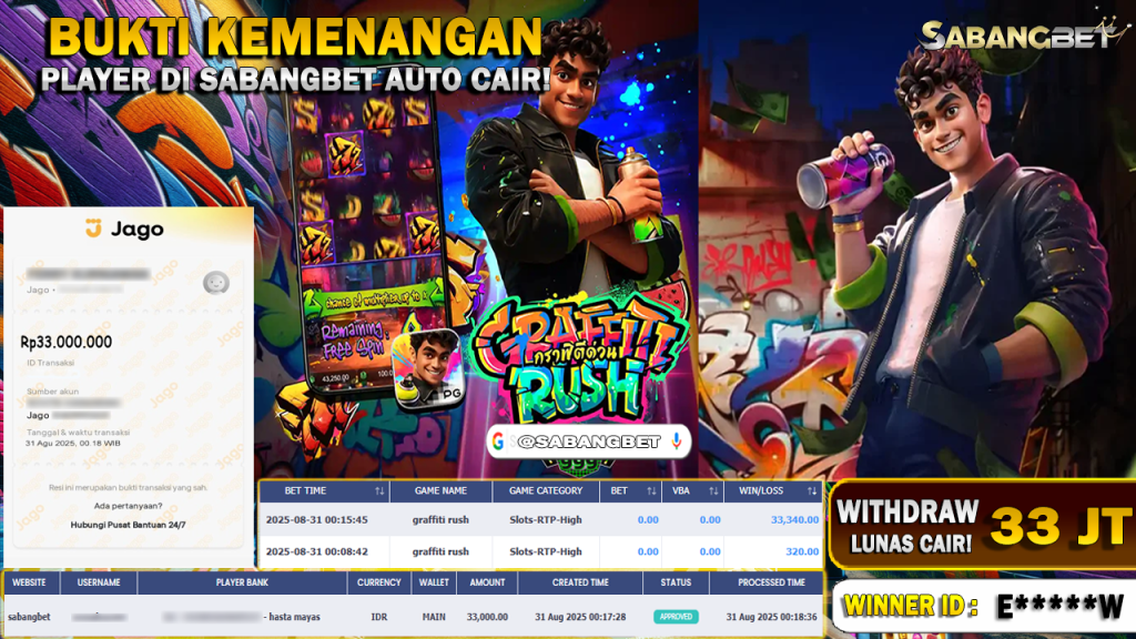 BUKTI KEMENANGAN 31 AGUSTUS 2025 DI GAME GRAFFITI RUSH ( POCKET GAME SOFT ) WD 33 JUTA