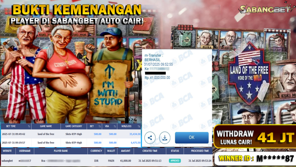 BUKTI KEMENANGAN 31 JULI 2025 DI GAME LAND OF THE FREE WD 41 JUTA