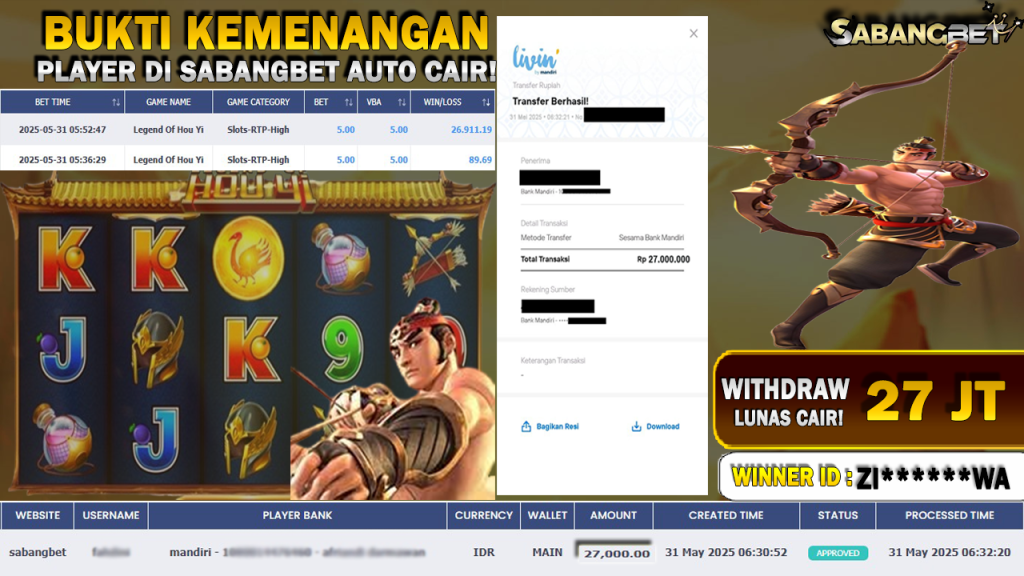 BUKTI KEMENANGAN 31 MEI 2025 DI GAME LEGEND OF HOU YI WD 27 JUTA